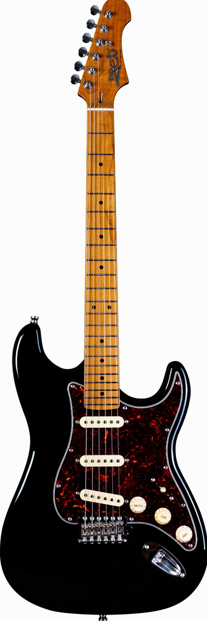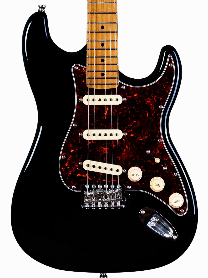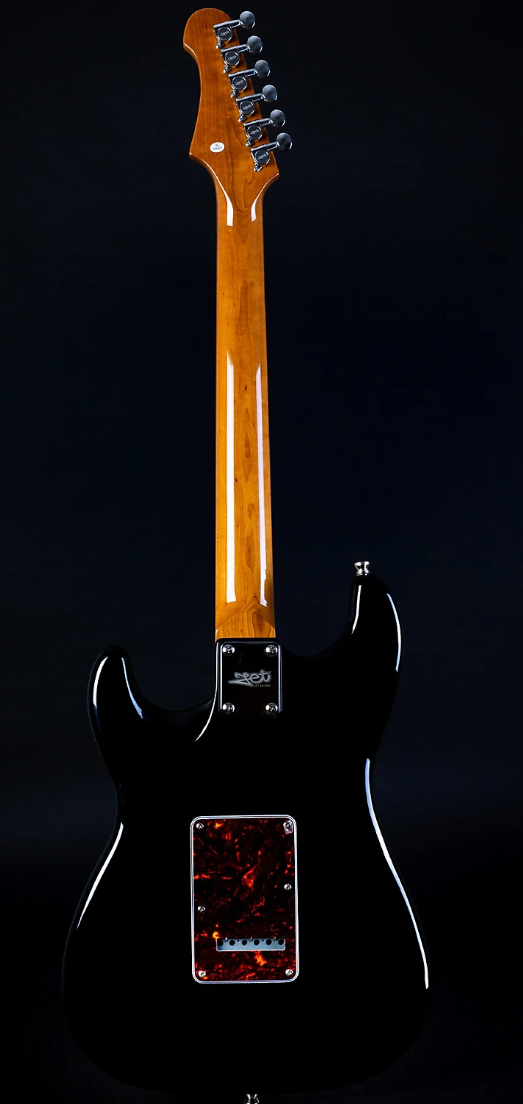 phenomenal spec sheet and build quality for the price, the Jet JS-300 S-Style electric guitar is here presented in Black with Roasted Maple Fretboard. Jet guitars are inspired by classic high end guitars, and they really do look and feel much more expensive than they in fact are! The JS-300 is fitted with three ceramic magnet single-coil pickups, resulting in an appropriate Stratty twang. The tremolo enables the whammy bar action to match, while the Roasted Maple fretboard is usually unseen at this price.
